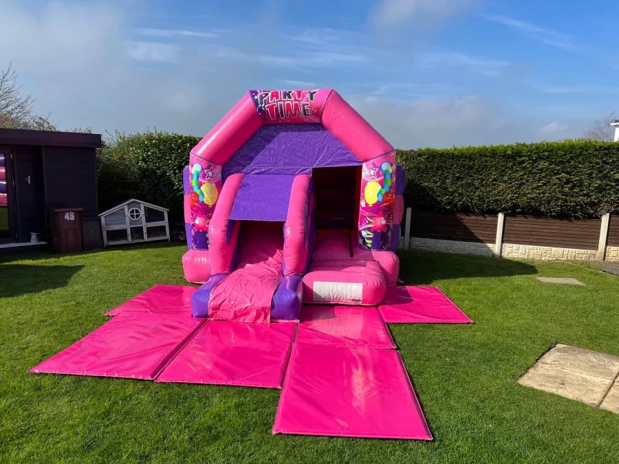 Add a pop of pink and a whole lot of fun to your next celebration with our Party Time Pink Front Combi Slide! Perfect for birthdays, school events, fun days, and more – this vibrant inflatable combines a traditional bouncy castle with an exciting front slide for double the entertainment!