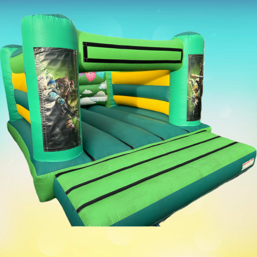 🐢 Calling all Ninja Turtles fans! Get ready for an epic adventure with the Ninja Turtles Castle 12ftx12ft - Indoor Low Height. This inflatable castle is perfect for indoor play and is designed with the iconic Ninja Turtles theme, featuring your favourite crime-fighting turtles - Leonardo, Donatello, Michelangelo, and Raphael.