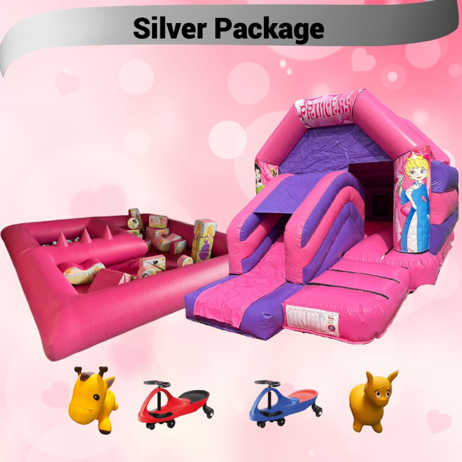 Turn your child’s celebration into a fairy-tale adventure with our Princess Front Combi Slide – Silver Package! This beautifully themed party setup is bursting with colour, magic, and fun – perfect for little royalty and their guests.